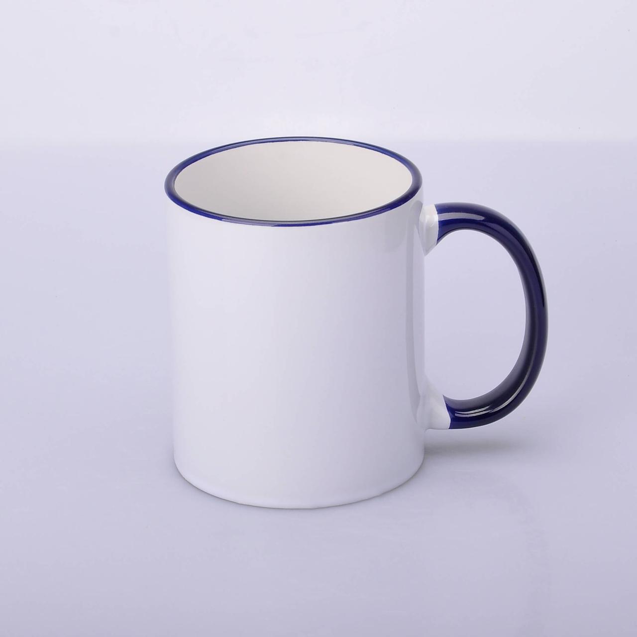 Чашка для сублімації біла керамічна з кольоровим обідком і ручкою.